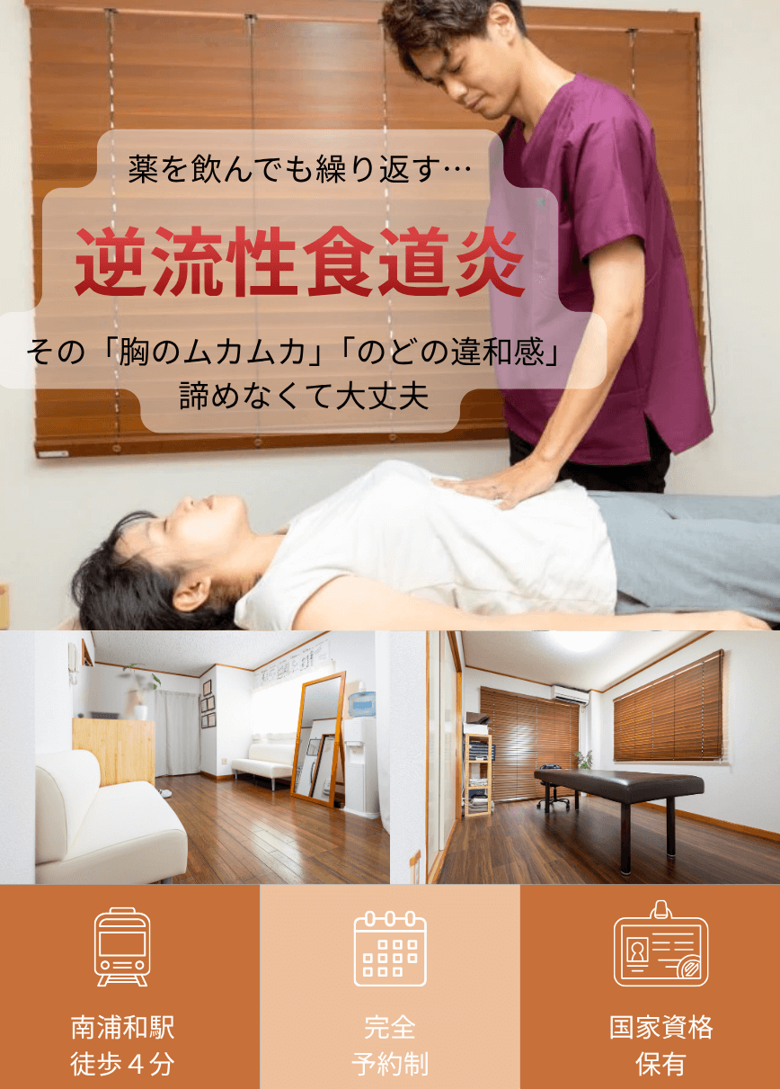 逆流性食道炎は、胃や食道の局所的な問題だけでなく、自律神経の乱れや姿勢の崩れ、内臓の位置の変化が関係しているケースも多いです。当院ではこうした全身のバランスから整える施術を行っており、「薬では変わらなかった」という方からも改善の声を多くいただいています。